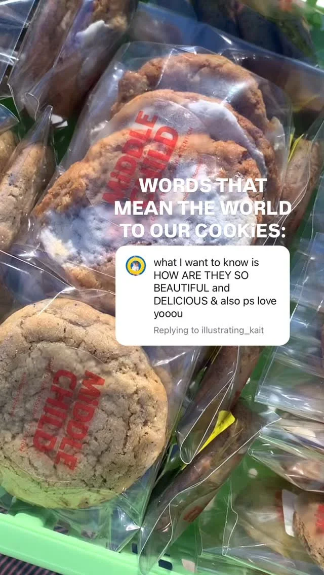 Hello Gillybeans and Mrs. Gingerbread-heads! With the help of y’all and the guys over at ‘We’re Here To Help’ pod Middle Child Cookies has received a ton of love and support! Originally Beverly was a caller with a work issue that needed Jake + Gareth’s advice, to parmesan the floor, of course—a year later they’re still chatting and it’s now about the dream of MCC realized! Someone ring the bell!